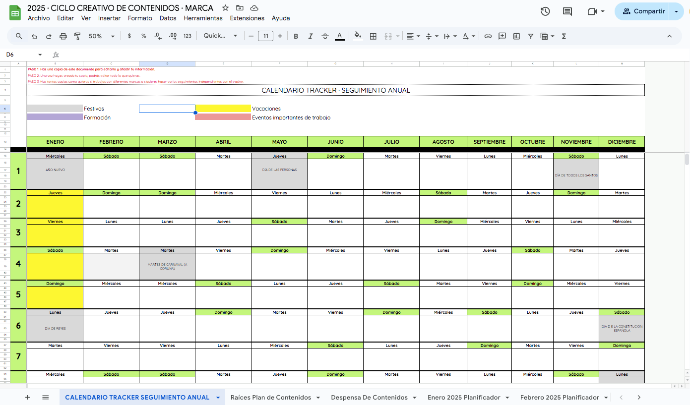 ¡Calendario tracker anual! Para hacer un seguimiento anual de contenidos, hábitos o procesos.